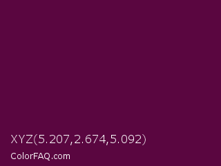 XYZ 5.207,2.674,5.092 Color is a very dark magenta color and the nearest color is Mulberry Wood #5c0536. Hex code #5a0640 and RGB value is rgb(90,6,64). In RGB color space, this color is composed of 35% red, 2% green, 25% blue, In CMYK color space, this color is composed of 0% cyan, 93% magenta, 29% yellow , 65% black , In HSL color space, this color has a hue angle of 319° , 88% saturation and 19% lightness.