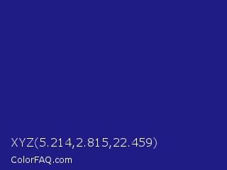 XYZ 5.214,2.815,22.459 Color is a normal indigo color and the nearest color is Jacksons Purple #20208d. Hex code #1f1c85 and RGB value is rgb(31,28,133). In RGB color space, this color is composed of 12% red, 11% green, 52% blue, In CMYK color space, this color is composed of 77% cyan, 79% magenta, 0% yellow , 48% black , In HSL color space, this color has a hue angle of 242° , 65% saturation and 32% lightness.