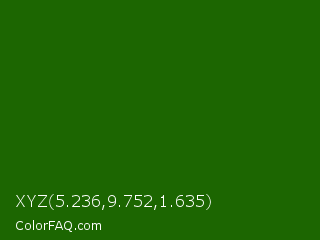 XYZ 5.236,9.752,1.635 Color is a very dark green color and the nearest color is Lincoln Green #195905. Hex code #1c6601 and RGB value is rgb(28,102,1). In RGB color space, this color is composed of 11% red, 40% green, 0% blue, In CMYK color space, this color is composed of 73% cyan, 0% magenta, 99% yellow , 60% black , In HSL color space, this color has a hue angle of 104° , 98% saturation and 20% lightness.