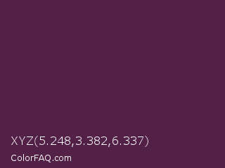 XYZ 5.248,3.382,6.337 Color is a dark magenta color and the nearest color is Wine Berry #591d35. Hex code #532147 and RGB value is rgb(83,33,71). In RGB color space, this color is composed of 33% red, 13% green, 28% blue, In CMYK color space, this color is composed of 0% cyan, 60% magenta, 14% yellow , 67% black , In HSL color space, this color has a hue angle of 314° , 43% saturation and 23% lightness.