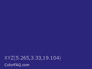 XYZ 5.265,3.33,19.104 Color is a normal indigo color and the nearest color is St Patricks Blue #23297a. Hex code #2b267b and RGB value is rgb(43,38,123). In RGB color space, this color is composed of 17% red, 15% green, 48% blue, In CMYK color space, this color is composed of 65% cyan, 69% magenta, 0% yellow , 52% black , In HSL color space, this color has a hue angle of 244° , 53% saturation and 32% lightness.