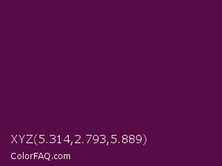 XYZ 5.314,2.793,5.889 Color is a very dark magenta color and the nearest color is Mulberry Wood #5c0536. Hex code #590b45 and RGB value is rgb(89,11,69). In RGB color space, this color is composed of 35% red, 4% green, 27% blue, In CMYK color space, this color is composed of 0% cyan, 88% magenta, 22% yellow , 65% black , In HSL color space, this color has a hue angle of 315° , 78% saturation and 20% lightness.