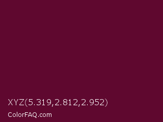 XYZ 5.319,2.812,2.952 Color is a very dark rose color and the nearest color is Mulberry Wood #5c0536. Hex code #5f082f and RGB value is rgb(95,8,47). In RGB color space, this color is composed of 37% red, 3% green, 18% blue, In CMYK color space, this color is composed of 0% cyan, 92% magenta, 51% yellow , 63% black , In HSL color space, this color has a hue angle of 333° , 84% saturation and 20% lightness.