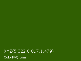 XYZ 5.322,8.817,1.479 Color is a very dark green color and the nearest color is Dell #396413. Hex code #305f02 and RGB value is rgb(48,95,2). In RGB color space, this color is composed of 19% red, 37% green, 1% blue, In CMYK color space, this color is composed of 49% cyan, 0% magenta, 98% yellow , 63% black , In HSL color space, this color has a hue angle of 90° , 96% saturation and 19% lightness.