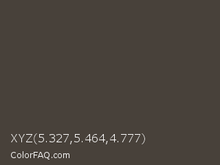 XYZ 5.327,5.464,4.777 Color is a dark orange color and the nearest color is Armadillo #433e37. Hex code #48413a and RGB value is rgb(72,65,58). In RGB color space, this color is composed of 28% red, 25% green, 23% blue, In CMYK color space, this color is composed of 0% cyan, 10% magenta, 19% yellow , 72% black , In HSL color space, this color has a hue angle of 30° , 11% saturation and 25% lightness.