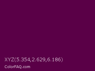 XYZ 5.354,2.629,6.186 Color is a very dark magenta color and the nearest color is Pompadour #660045. Hex code #5a0047 and RGB value is rgb(90,0,71). In RGB color space, this color is composed of 35% red, 0% green, 28% blue, In CMYK color space, this color is composed of 0% cyan, 100% magenta, 21% yellow , 65% black , In HSL color space, this color has a hue angle of 313° , 100% saturation and 18% lightness.