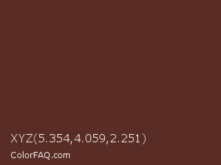 XYZ 5.354,4.059,2.251 Color is a dark red color and the nearest color is Caput Mortuum #592720. Hex code #592c25 and RGB value is rgb(89,44,37). In RGB color space, this color is composed of 35% red, 17% green, 15% blue, In CMYK color space, this color is composed of 0% cyan, 51% magenta, 58% yellow , 65% black , In HSL color space, this color has a hue angle of 8° , 41% saturation and 25% lightness.