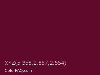 XYZ 5.358,2.857,2.554 Color is a very dark rose color and the nearest color is Black Rose #67032d. Hex code #60092b and RGB value is rgb(96,9,43). In RGB color space, this color is composed of 38% red, 4% green, 17% blue, In CMYK color space, this color is composed of 0% cyan, 91% magenta, 55% yellow , 62% black , In HSL color space, this color has a hue angle of 337° , 83% saturation and 21% lightness.
