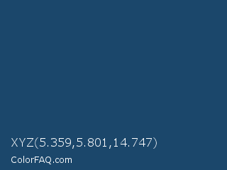XYZ 5.359,5.801,14.747 Color is a dark blue color and the nearest color is Chathams Blue #175579. Hex code #1b476b and RGB value is rgb(27,71,107). In RGB color space, this color is composed of 11% red, 28% green, 42% blue, In CMYK color space, this color is composed of 75% cyan, 34% magenta, 0% yellow , 58% black , In HSL color space, this color has a hue angle of 207° , 60% saturation and 26% lightness.