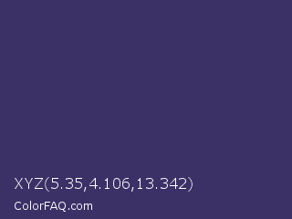 XYZ 5.35,4.106,13.342 Color is a dark indigo color and the nearest color is Jacarta #3a2a6a. Hex code #3b3167 and RGB value is rgb(59,49,103). In RGB color space, this color is composed of 23% red, 19% green, 40% blue, In CMYK color space, this color is composed of 43% cyan, 52% magenta, 0% yellow , 60% black , In HSL color space, this color has a hue angle of 251° , 36% saturation and 30% lightness.