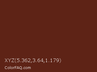 XYZ 5.362,3.64,1.179 Color is a dark red color and the nearest color is Espresso #612718. Hex code #5e2316 and RGB value is rgb(94,35,22). In RGB color space, this color is composed of 37% red, 14% green, 9% blue, In CMYK color space, this color is composed of 0% cyan, 63% magenta, 77% yellow , 63% black , In HSL color space, this color has a hue angle of 11° , 62% saturation and 23% lightness.