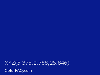 XYZ 5.375,2.788,25.846 Color is a dark blue color and the nearest color is Indigo Dye #091f92. Hex code #081b8e and RGB value is rgb(8,27,142). In RGB color space, this color is composed of 3% red, 11% green, 56% blue, In CMYK color space, this color is composed of 94% cyan, 81% magenta, 0% yellow , 44% black , In HSL color space, this color has a hue angle of 231° , 89% saturation and 29% lightness.