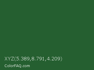 XYZ 5.389,8.791,4.209 Color is a dark green color and the nearest color is Mughal Green #306030. Hex code #255f30 and RGB value is rgb(37,95,48). In RGB color space, this color is composed of 15% red, 37% green, 19% blue, In CMYK color space, this color is composed of 61% cyan, 0% magenta, 49% yellow , 63% black , In HSL color space, this color has a hue angle of 131° , 44% saturation and 26% lightness.