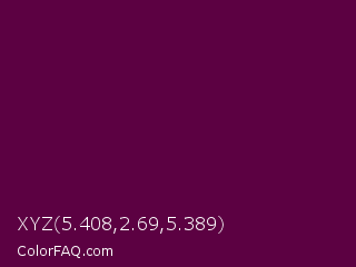XYZ 5.408,2.69,5.389 Color is a very dark magenta color and the nearest color is Pompadour #660045. Hex code #5c0142 and RGB value is rgb(92,1,66). In RGB color space, this color is composed of 36% red, 0% green, 26% blue, In CMYK color space, this color is composed of 0% cyan, 99% magenta, 28% yellow , 64% black , In HSL color space, this color has a hue angle of 317° , 98% saturation and 18% lightness.