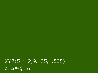 XYZ 5.412,9.135,1.535 Color is a very dark green color and the nearest color is Dell #396413. Hex code #2e6102 and RGB value is rgb(46,97,2). In RGB color space, this color is composed of 18% red, 38% green, 1% blue, In CMYK color space, this color is composed of 53% cyan, 0% magenta, 98% yellow , 62% black , In HSL color space, this color has a hue angle of 92° , 96% saturation and 19% lightness.