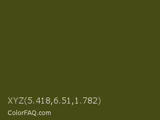 XYZ 5.418,6.51,1.782 Color is a very dark yellow color and the nearest color is Army Green #4b5320. Hex code #494b17 and RGB value is rgb(73,75,23). In RGB color space, this color is composed of 29% red, 29% green, 9% blue, In CMYK color space, this color is composed of 3% cyan, 0% magenta, 69% yellow , 71% black , In HSL color space, this color has a hue angle of 62° , 53% saturation and 19% lightness.