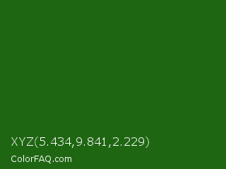 XYZ 5.434,9.841,2.229 Color is a dark green color and the nearest color is Lincoln Green #195905. Hex code #1f6613 and RGB value is rgb(31,102,19). In RGB color space, this color is composed of 12% red, 40% green, 7% blue, In CMYK color space, this color is composed of 70% cyan, 0% magenta, 81% yellow , 60% black , In HSL color space, this color has a hue angle of 111° , 69% saturation and 24% lightness.