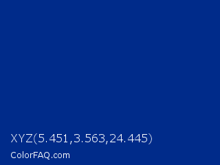 XYZ 5.451,3.563,24.445 Color is a dark blue color and the nearest color is Air Force Blue USAF #00308f. Hex code #002b8a and RGB value is rgb(0,43,138). In RGB color space, this color is composed of 0% red, 17% green, 54% blue, In CMYK color space, this color is composed of 100% cyan, 69% magenta, 0% yellow , 46% black , In HSL color space, this color has a hue angle of 221° , 100% saturation and 27% lightness.