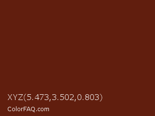 XYZ 5.473,3.502,0.803 Color is a very dark red color and the nearest color is Redwood #5d1e0f. Hex code #611e0e and RGB value is rgb(97,30,14). In RGB color space, this color is composed of 38% red, 12% green, 5% blue, In CMYK color space, this color is composed of 0% cyan, 69% magenta, 86% yellow , 62% black , In HSL color space, this color has a hue angle of 12° , 75% saturation and 22% lightness.