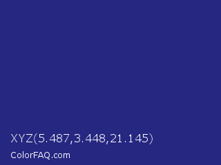 XYZ 5.487,3.448,21.145 Color is a normal blue color and the nearest color is St Patricks Blue #23297a. Hex code #262781 and RGB value is rgb(38,39,129). In RGB color space, this color is composed of 15% red, 15% green, 51% blue, In CMYK color space, this color is composed of 71% cyan, 70% magenta, 0% yellow , 49% black , In HSL color space, this color has a hue angle of 239° , 54% saturation and 33% lightness.
