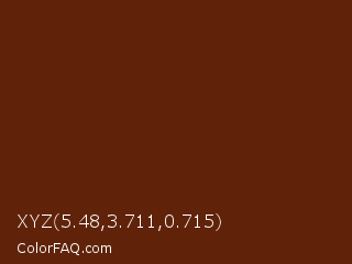 XYZ 5.48,3.711,0.715 Color is a very dark orange color and the nearest color is Redwood #5d1e0f. Hex code #60230a and RGB value is rgb(96,35,10). In RGB color space, this color is composed of 38% red, 14% green, 4% blue, In CMYK color space, this color is composed of 0% cyan, 64% magenta, 90% yellow , 62% black , In HSL color space, this color has a hue angle of 17° , 81% saturation and 21% lightness.