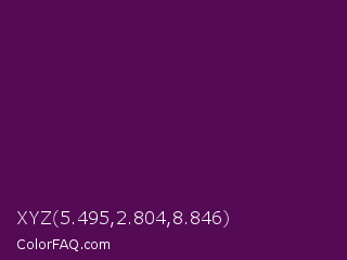 XYZ 5.495,2.804,8.846 Color is a very dark magenta color and the nearest color is Clairvoyant #480656. Hex code #550a55 and RGB value is rgb(85,10,85). In RGB color space, this color is composed of 33% red, 4% green, 33% blue, In CMYK color space, this color is composed of 0% cyan, 88% magenta, 0% yellow , 67% black , In HSL color space, this color has a hue angle of 300° , 79% saturation and 19% lightness.