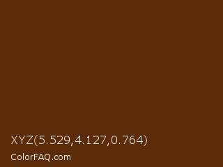XYZ 5.529,4.127,0.764 Color is a very dark orange color and the nearest color is Seal Brown #59260b. Hex code #5e2b09 and RGB value is rgb(94,43,9). In RGB color space, this color is composed of 37% red, 17% green, 4% blue, In CMYK color space, this color is composed of 0% cyan, 54% magenta, 90% yellow , 63% black , In HSL color space, this color has a hue angle of 24° , 83% saturation and 20% lightness.