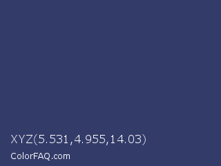 XYZ 5.531,4.955,14.03 Color is a normal blue color and the nearest color is Rhino #2e3f62. Hex code #333c69 and RGB value is rgb(51,60,105). In RGB color space, this color is composed of 20% red, 24% green, 41% blue, In CMYK color space, this color is composed of 51% cyan, 43% magenta, 0% yellow , 59% black , In HSL color space, this color has a hue angle of 230° , 35% saturation and 31% lightness.