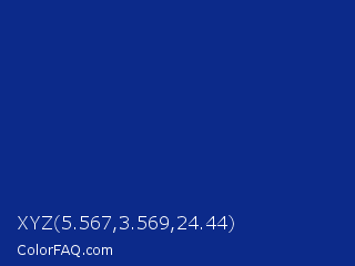 XYZ 5.567,3.569,24.44 Color is a dark blue color and the nearest color is Indigo Dye #091f92. Hex code #0c2a8a and RGB value is rgb(12,42,138). In RGB color space, this color is composed of 5% red, 16% green, 54% blue, In CMYK color space, this color is composed of 91% cyan, 70% magenta, 0% yellow , 46% black , In HSL color space, this color has a hue angle of 226° , 84% saturation and 29% lightness.