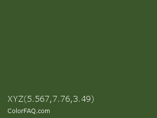 XYZ 5.567,7.76,3.49 Color is a dark green color and the nearest color is Mughal Green #306030. Hex code #3b562b and RGB value is rgb(59,86,43). In RGB color space, this color is composed of 23% red, 34% green, 17% blue, In CMYK color space, this color is composed of 31% cyan, 0% magenta, 50% yellow , 66% black , In HSL color space, this color has a hue angle of 98° , 33% saturation and 25% lightness.