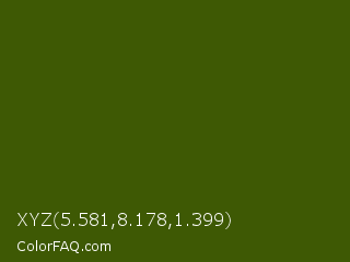 XYZ 5.581,8.178,1.399 Color is a very dark lime color and the nearest color is Verdun Green #495400. Hex code #3e5904 and RGB value is rgb(62,89,4). In RGB color space, this color is composed of 24% red, 35% green, 2% blue, In CMYK color space, this color is composed of 30% cyan, 0% magenta, 96% yellow , 65% black , In HSL color space, this color has a hue angle of 79° , 91% saturation and 18% lightness.