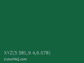 XYZ 5.581,9.4,6.078 Color is a dark green color and the nearest color is Jewel #126b40. Hex code #12633e and RGB value is rgb(18,99,62). In RGB color space, this color is composed of 7% red, 39% green, 24% blue, In CMYK color space, this color is composed of 82% cyan, 0% magenta, 37% yellow , 61% black , In HSL color space, this color has a hue angle of 153° , 69% saturation and 23% lightness.