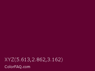 XYZ 5.613,2.862,3.162 Color is a very dark rose color and the nearest color is Black Rose #67032d. Hex code #620231 and RGB value is rgb(98,2,49). In RGB color space, this color is composed of 38% red, 1% green, 19% blue, In CMYK color space, this color is composed of 0% cyan, 98% magenta, 50% yellow , 62% black , In HSL color space, this color has a hue angle of 331° , 96% saturation and 20% lightness.