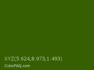 XYZ 5.624,8.973,1.493 Color is a very dark green color and the nearest color is Dell #396413. Hex code #365f02 and RGB value is rgb(54,95,2). In RGB color space, this color is composed of 21% red, 37% green, 1% blue, In CMYK color space, this color is composed of 43% cyan, 0% magenta, 98% yellow , 63% black , In HSL color space, this color has a hue angle of 86° , 96% saturation and 19% lightness.