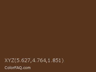 XYZ 5.627,4.764,1.851 Color is a dark orange color and the nearest color is Jambalaya #5b3013. Hex code #59351e and RGB value is rgb(89,53,30). In RGB color space, this color is composed of 35% red, 21% green, 12% blue, In CMYK color space, this color is composed of 0% cyan, 40% magenta, 66% yellow , 65% black , In HSL color space, this color has a hue angle of 23° , 50% saturation and 23% lightness.