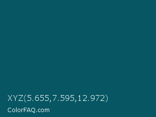 XYZ 5.655,7.595,12.972 Color is a very dark cyan color and the nearest color is Deep Sea Green #095859. Hex code #065663 and RGB value is rgb(6,86,99). In RGB color space, this color is composed of 2% red, 34% green, 39% blue, In CMYK color space, this color is composed of 94% cyan, 13% magenta, 0% yellow , 61% black , In HSL color space, this color has a hue angle of 188° , 89% saturation and 21% lightness.