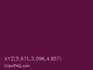 XYZ 5.671,3.098,4.857 Color is a very dark magenta color and the nearest color is Mulberry Wood #5c0536. Hex code #5e103e and RGB value is rgb(94,16,62). In RGB color space, this color is composed of 37% red, 6% green, 24% blue, In CMYK color space, this color is composed of 0% cyan, 83% magenta, 34% yellow , 63% black , In HSL color space, this color has a hue angle of 325° , 71% saturation and 22% lightness.