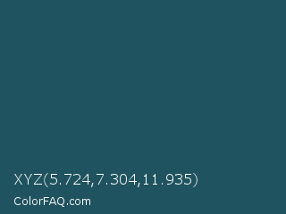 XYZ 5.724,7.304,11.935 Color is a dark cyan color and the nearest color is Blue Dianne #204852. Hex code #1f535f and RGB value is rgb(31,83,95). In RGB color space, this color is composed of 12% red, 33% green, 37% blue, In CMYK color space, this color is composed of 67% cyan, 13% magenta, 0% yellow , 63% black , In HSL color space, this color has a hue angle of 191° , 51% saturation and 25% lightness.