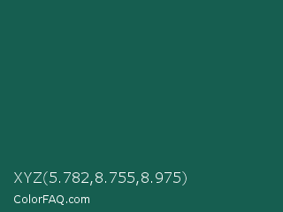 XYZ 5.782,8.755,8.975 Color is a dark cyan color and the nearest color is Eden #105852. Hex code #165e50 and RGB value is rgb(22,94,80). In RGB color space, this color is composed of 9% red, 37% green, 31% blue, In CMYK color space, this color is composed of 77% cyan, 0% magenta, 15% yellow , 63% black , In HSL color space, this color has a hue angle of 168° , 62% saturation and 23% lightness.