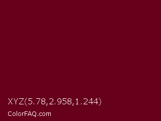 XYZ 5.78,2.958,1.244 Color is a very dark red color and the nearest color is Bordeaux #5c0120. Hex code #67001a and RGB value is rgb(103,0,26). In RGB color space, this color is composed of 40% red, 0% green, 10% blue, In CMYK color space, this color is composed of 0% cyan, 100% magenta, 75% yellow , 60% black , In HSL color space, this color has a hue angle of 345° , 100% saturation and 20% lightness.
