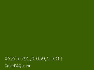 XYZ 5.791,9.059,1.501 Color is a very dark green color and the nearest color is Dell #396413. Hex code #395f02 and RGB value is rgb(57,95,2). In RGB color space, this color is composed of 22% red, 37% green, 1% blue, In CMYK color space, this color is composed of 40% cyan, 0% magenta, 98% yellow , 63% black , In HSL color space, this color has a hue angle of 85° , 96% saturation and 19% lightness.
