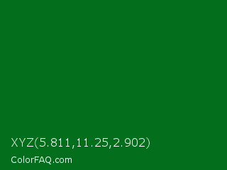XYZ 5.811,11.25,2.902 Color is a very dark green color and the nearest color is Deep Green #056608. Hex code #036e1b and RGB value is rgb(3,110,27). In RGB color space, this color is composed of 1% red, 43% green, 11% blue, In CMYK color space, this color is composed of 97% cyan, 0% magenta, 75% yellow , 57% black , In HSL color space, this color has a hue angle of 133° , 95% saturation and 22% lightness.