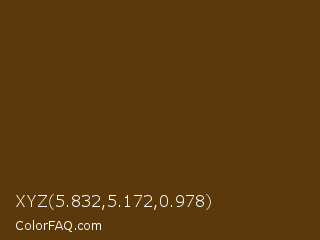 XYZ 5.832,5.172,0.978 Color is a very dark orange color and the nearest color is Pineapple #563c0d. Hex code #5b390a and RGB value is rgb(91,57,10). In RGB color space, this color is composed of 36% red, 22% green, 4% blue, In CMYK color space, this color is composed of 0% cyan, 37% magenta, 89% yellow , 64% black , In HSL color space, this color has a hue angle of 35° , 80% saturation and 20% lightness.