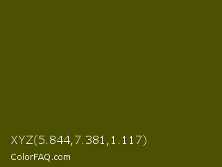 XYZ 5.844,7.381,1.117 Color is a very dark yellow color and the nearest color is Verdun Green #495400. Hex code #4b5100 and RGB value is rgb(75,81,0). In RGB color space, this color is composed of 29% red, 32% green, 0% blue, In CMYK color space, this color is composed of 7% cyan, 0% magenta, 100% yellow , 68% black , In HSL color space, this color has a hue angle of 64° , 100% saturation and 16% lightness.