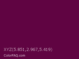 XYZ 5.851,2.967,5.419 Color is a very dark magenta color and the nearest color is Pompadour #660045. Hex code #600442 and RGB value is rgb(96,4,66). In RGB color space, this color is composed of 38% red, 2% green, 26% blue, In CMYK color space, this color is composed of 0% cyan, 96% magenta, 31% yellow , 62% black , In HSL color space, this color has a hue angle of 320° , 92% saturation and 20% lightness.
