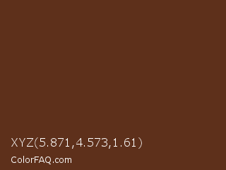 XYZ 5.871,4.573,1.61 Color is a dark orange color and the nearest color is Jambalaya #5b3013. Hex code #5e301b and RGB value is rgb(94,48,27). In RGB color space, this color is composed of 37% red, 19% green, 11% blue, In CMYK color space, this color is composed of 0% cyan, 49% magenta, 71% yellow , 63% black , In HSL color space, this color has a hue angle of 19° , 55% saturation and 24% lightness.