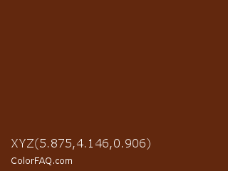 XYZ 5.875,4.146,0.906 Color is a very dark orange color and the nearest color is Seal Brown #59260b. Hex code #62280e and RGB value is rgb(98,40,14). In RGB color space, this color is composed of 38% red, 16% green, 5% blue, In CMYK color space, this color is composed of 0% cyan, 59% magenta, 86% yellow , 62% black , In HSL color space, this color has a hue angle of 19° , 75% saturation and 22% lightness.
