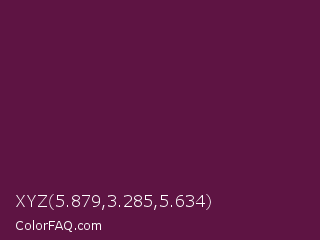 XYZ 5.879,3.285,5.634 Color is a very dark magenta color and the nearest color is Wine Berry #591d35. Hex code #5e1443 and RGB value is rgb(94,20,67). In RGB color space, this color is composed of 37% red, 8% green, 26% blue, In CMYK color space, this color is composed of 0% cyan, 79% magenta, 29% yellow , 63% black , In HSL color space, this color has a hue angle of 322° , 65% saturation and 22% lightness.