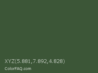 XYZ 5.881,7.892,4.828 Color is a dark green color and the nearest color is Tom Thumb #3f583b. Hex code #3c5637 and RGB value is rgb(60,86,55). In RGB color space, this color is composed of 24% red, 34% green, 22% blue, In CMYK color space, this color is composed of 30% cyan, 0% magenta, 36% yellow , 66% black , In HSL color space, this color has a hue angle of 110° , 22% saturation and 28% lightness.