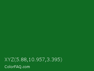 XYZ 5.88,10.957,3.395 Color is a dark green color and the nearest color is La Salle Green #087830. Hex code #106c23 and RGB value is rgb(16,108,35). In RGB color space, this color is composed of 6% red, 42% green, 14% blue, In CMYK color space, this color is composed of 85% cyan, 0% magenta, 68% yellow , 58% black , In HSL color space, this color has a hue angle of 132° , 74% saturation and 24% lightness.